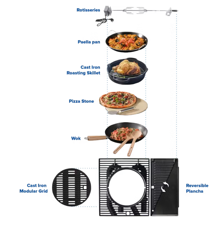 Spolu s velkou litinovou smaltovanou grilovací plochou je tento gril ideální pro přípravu široké škály pokrmů pod širým nebem. Výkonný postranní hořák lze použít k přípravě příloh ke grilovanému jídlu a snadno tak můžete připravit rozmanité kulinářské hody.