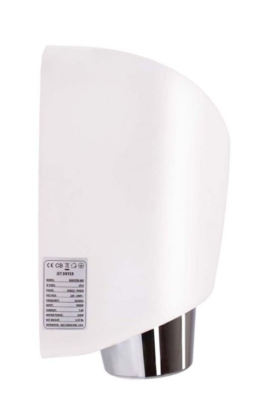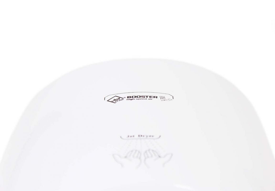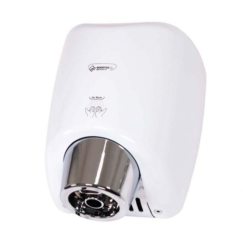 Osoušeč rukou BOOSTER se od jiných osoušečů vyznačuje výraznou pochromovanou tryskou kruhového tvaru. Díky silnému 550 W motoru je vysušení rukou velmi rychlé.
