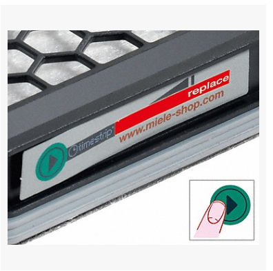 Timestrip®. Některé originální filtry Miele jsou vybaveny funkcíTimestrip®. Tuto novou indikaci výměny, umístěnou přímo na filtru, aktivujete při vložení filtru do přístroje silným zatlačením na šipku. Pokud je proužek celý červený, je filtr zanesený a je potřeba ho vyměnit. Systém Timestrip® vám pomůže kontrolovat optimální funkci filtru.