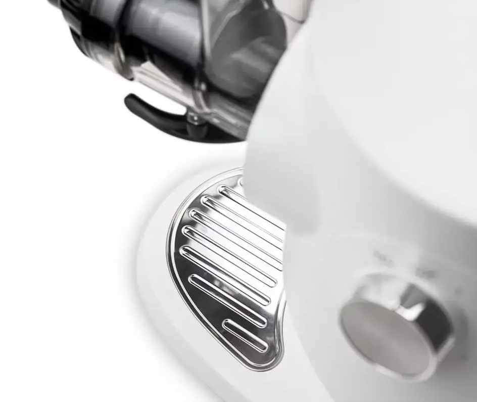 • Lisovací systém je nově doplněný o extrakční čepel, která je ukrytá na jeho konci. Těsně předtím, než vylisovaný odpad opustí odšťavňovač, se čepel postará o jeho finální zpracování. Vymačká z něj poslední kapky šťávy a usnadní jeho odchod. Odšťavňovač se tak nehltí, pohodlně stíhá, a zejména má vyšší výtěžnost než odšťavňovače bez čepele.
