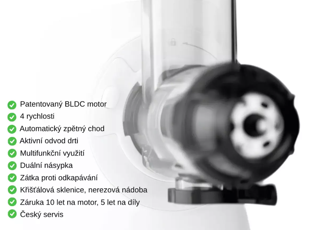 • Automatický zpětný chod je další funkcí, kterou u domácích šnekových odšťavňovačů nevídáme. Pro vás znamená opět o něco méně starostí. Odšťavňovač sám rozpozná, že je příliš zahlcený, začíná se ucpávat nebo že jste do něj vhodili velký kus mrkve. Šnek se v tom případě automaticky začne otáčet opačným směrem a po několika vteřinách se vrátí k běžnému chodu. Zpětný chod se může zopakovat i několikrát, dokud se odšťavňovač neuvolní. Motor je tím ochráněn před poškozením.