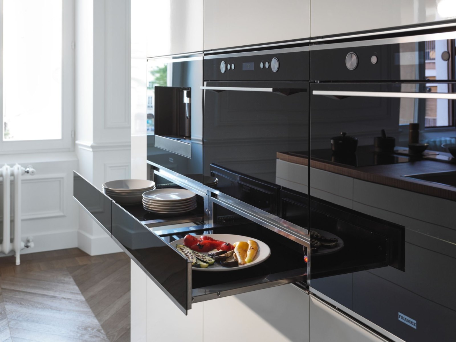Vestavná ohřívací zásuvka z řady Mythos. Kombinace černého skla a nerezi. Systém otevírání stisknutím/táhnutím, rovnoměrné šíření tepla díky recirkulaci vzduchu, snadné čištění. Udržuje teplotu hotových jídel, rozmrazuje, vaří při nízkých teplotách a ohřívá talíře.