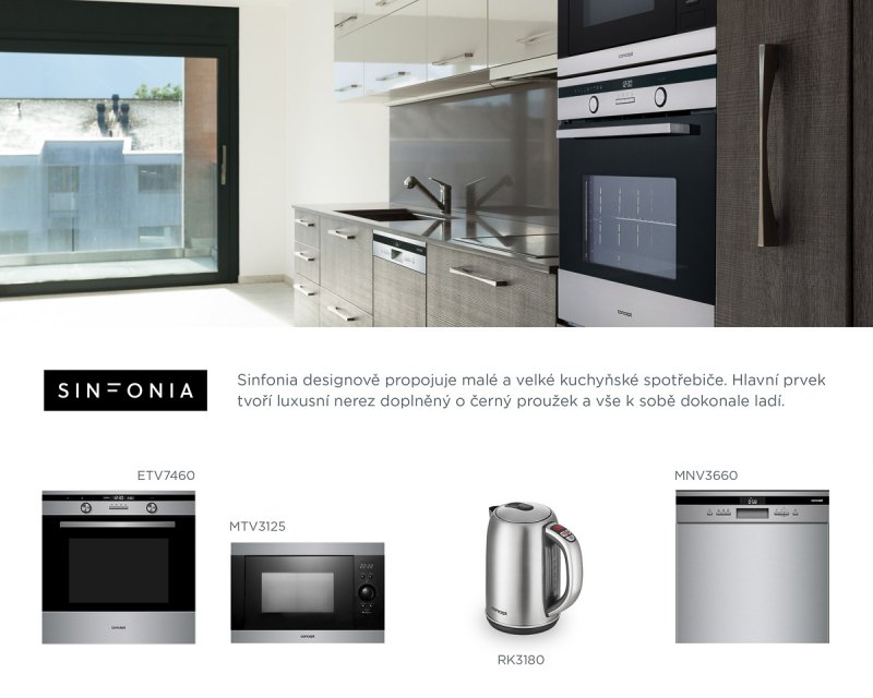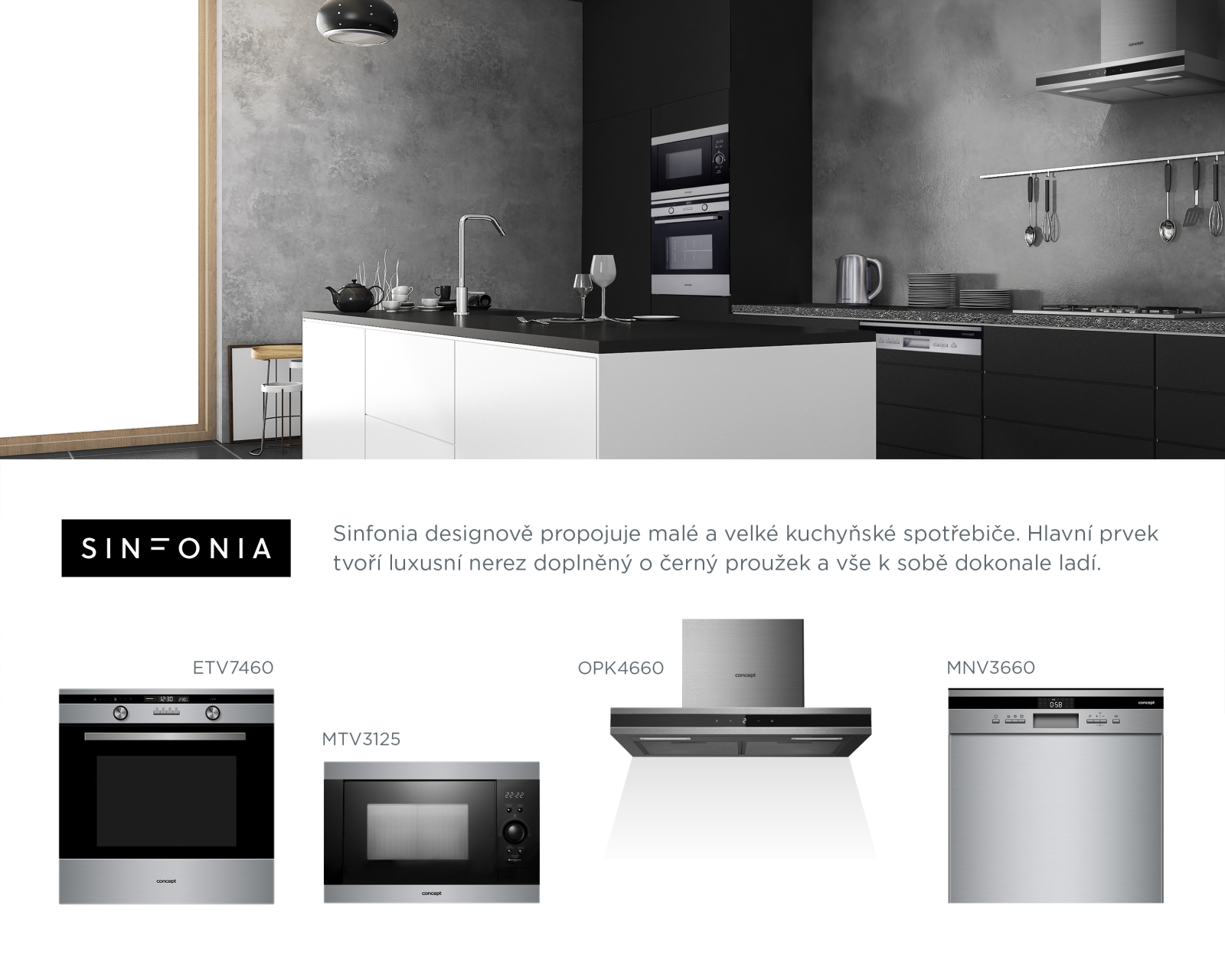Designové řešení pro celou kuchyň - to jsou designové linie Conceptu. Tato mikrovlnná trouba patří do linie Sinfonia, takže perfektně ladí k vestavným troubám ETV7360, ETV7460 a ETV7760. V tomto luxusním provedení jsme sjednotili barvy nerezu. U celé řady je kladen důraz na sladění jednotlivých designových prvků, ale i třeba barvy displejů. Sinfonia nabízí výborné řešení tam, kde je možné spotřebiče umístit ve vodorovné linii. Zároveň s mikrovlnnou troubou MTV3125 je ideálním řešením pro vertikální provedení kuchyně.