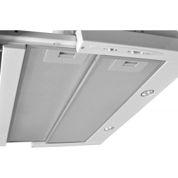 Vestavná digestoř výsuvná, šíře 50 cm, bílá s nerez lištou, max. výkon 266 m³/h (15 Pa), hlučnost Lw 54 – 62 dB(A), 3 rychlosti, odsávací jednotky mají individuálně vyvažovanou turbínu, motory jsou opatřené vratnými tepelnými pojistkami (při přetížení motoru vypne, po jeho vychladnutí opět sepne), mechanické posuvné ovládání, kovové sendvičové tukové filtry, které lze mýt v myčce, možnost práce v odtahovém i recirkulačním režimu, Výbava: úsporné LED osvětlení 2 × 2 W, zdarma zpětná klapka