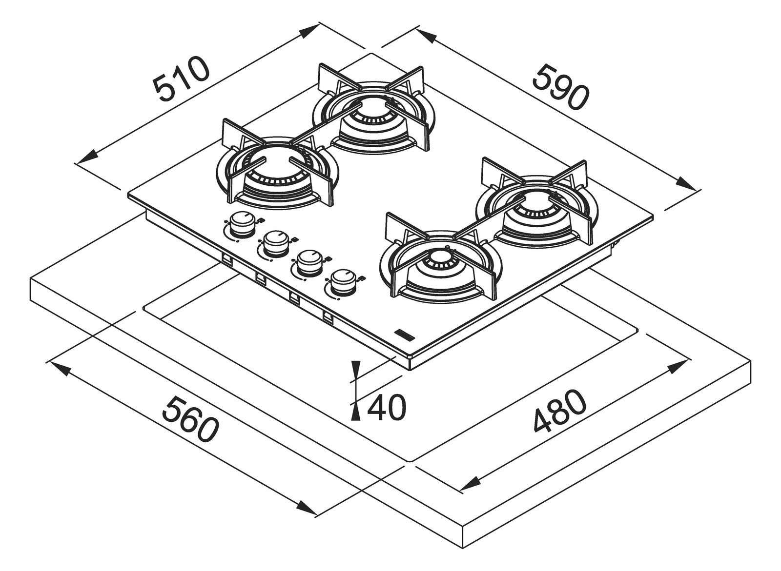 Plynová varná deska z řady Mythos. Provedení tvrzené černé sklo. 4 Plynové hořáky. Knoflíkové ovládání. Litinové rošty.