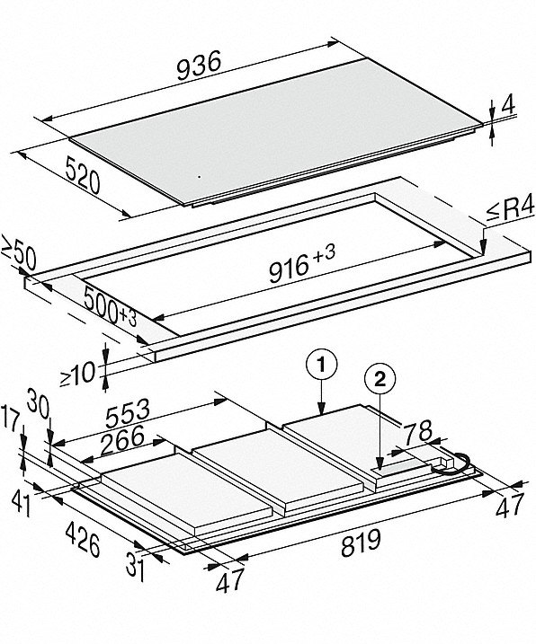 • Vnější rozměr výřezu v mm (šířka) při instalaci se zapuštěním: 940